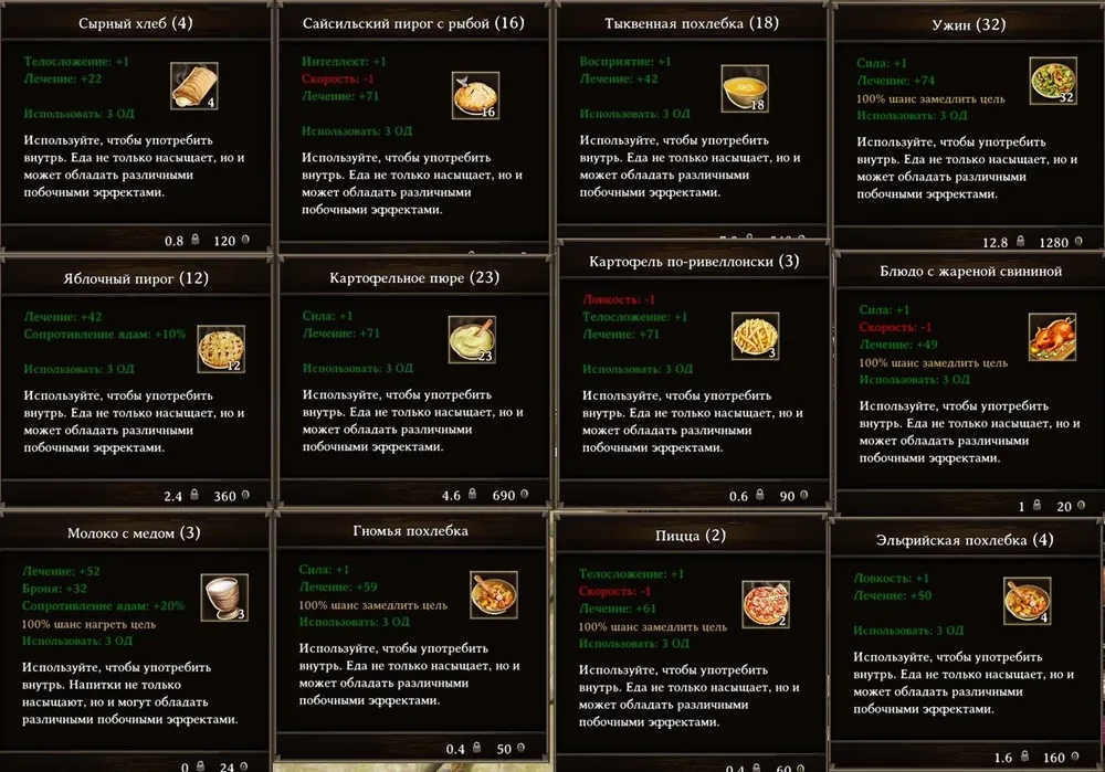 Чего никак не могли понять Искатели - зачем использовать ужин для приготовления других блюд? Добавишь в тарелку с ним кетчуп и получишь эльфийскую похлёбку, но пищевая ценность блюда упадёт! Повышение ловкости? Да, но кратковременное. Самым хитрым оказался рецепт гномьей похлёбки: для её приготовления было достаточно вылить в пятьдесят тарелок ужина единственную кружку пива. Также со снижением калорийности и побочными эффектами. Картофельное пюре вызвало большее одобрение, чем чипсы, так как при съедании не давало побочных эффектов. Но самым полезным блюдом герои единодушно признали молоко с мёдом, решено было оставить его запас на чёрный день, для употребления во время тяжёлых боёв.