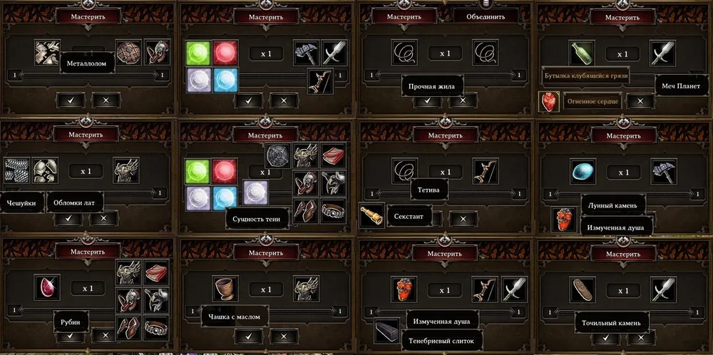 Применение сущности стихий на оружие заставило соблюдать осторожность и Рыцаря. Во-первых, оказалось, что на простое оружие можно добавить только одну сущность; применение второй заменяло первую. Во-вторых, оружие с дополнительным уроном позволяло добавить урон ещё от одного вида сущности. В-третьих, последующее применение тенебрия убирало один из видов урона, причём для его применение оружейная способность «Тенебрий» должна была быть не ниже трёх единиц. Ещё больше улучшало оружие применение «Измученной души», крайне редкого компонента. К огромному удивлению героев, тенебрий увеличивал характеристики только на режуще-колющем оружии и луках, применить его к ударному оружию не удавалось. Правда, у последнего и без того были достаточно высокие характеристики, поднятые при помощи лунного камня. Соединив компоненты «Огненное сердце» и «Бутылка клубящейся грязи»(!), рыцарь изготовила для себя легендарный Меч Планет, тут же улучшив его всеми доступными способами.
