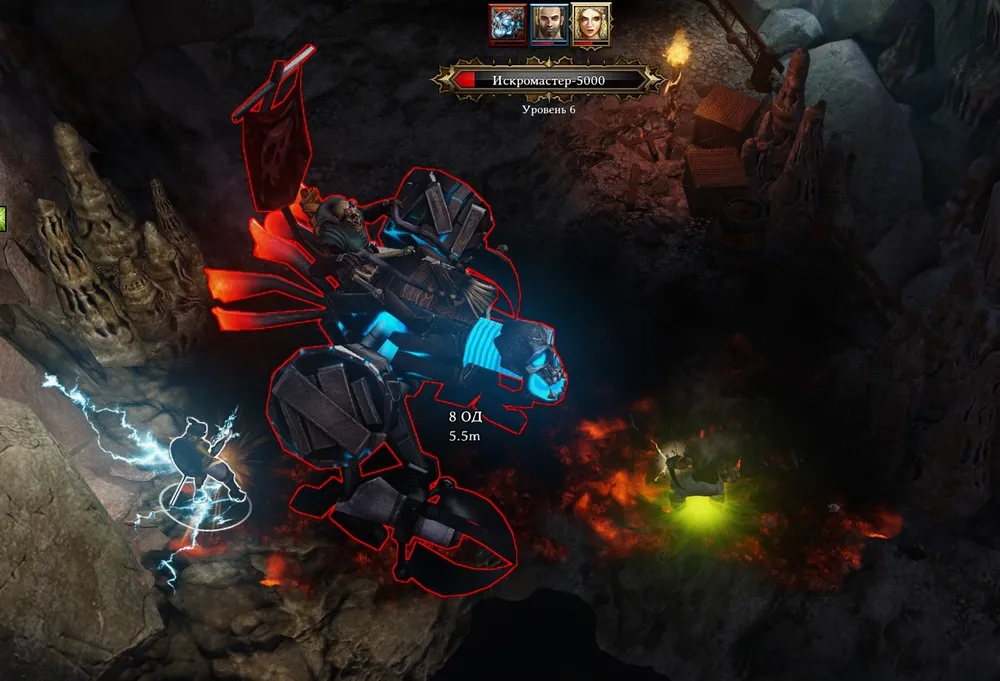 Ошалевшая ходячая груда железа обиделась на лучника, подорвавшего бочку с маслом у неё под ногами, и ринулась вперёд. Следопыт, отступивший за скалу, не мог вести огонь по роботу, но зато ИскроМастер, поглощённый идеей мести, не обращал никакого внимания на Рыцаря, расправляющегося с его свитой.