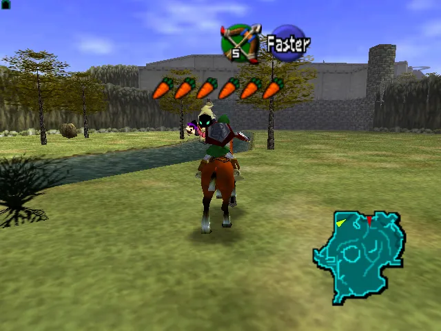 Семнадцатилетний Линк будущего не может пользоваться частью детских предметов – ну каким оружием в руках взрослого юноши смотрелась бы веточка дерева? Зато он в силах оседлать лошадь – и преодолевать дистанции огромного размера в считанные минуты. Здесь имеется один очень интересный момент, заслуживающий маленького отступления. Дело в том, что OoT, как стыдливая барышня, готова ловко спрятать большую часть своей красоты от ока ленивого, невнимательного, не желающего заглядывать вон в тот угол в поисках сам не знаю чего. И при этом все равно остаться незабываемым переживанием. Назвать все дополнительные задачи «сайд-квестами» язык не поворачивается – настолько хорошо они вплетены в повествование. Да, можно достигнуть финала, ни разу не оседлав Эпону (кличка лошади, если кто не понял). Можно не найти ни одной дополнительной бутылки, ни разу не подоить корову, не спасти превращенную в пауков семью в деревне Какарико. Но ради некоторых вещей, жизненно необходимых, требуется обшаривать каждый сантиметр локаций. И вот именно это заставляет вживаться в роль и мыслить за Линка, представляя себя на его месте.
