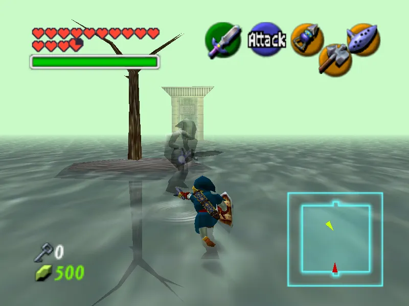 Чтобы дойти до шедевра, парню в зеленом колпачке требовалось решить множество хитроумных загадок. Причем решение зачастую отталкивается от имеющихся в арсенале средств, а продвижение вперед возможно лишь с получением нового прибамбаса. Компоновка «подземелий» проводит героя через многочисленные комнаты (все, кроме неочевидных секретных), в которых поначалу путаешься, но на деле любое подземелье организовано настолько логично, что умело ориентируясь с помощью карты и компаса, можно одолеть эти три-четыре наполненных ловушками и врагами этажа за какой-нибудь час. Когда понимаешь механизмы, по которым работает этот «дизайн интерьера», хочется просто восторгаться продуманностью и забыть безумную беготню из никуда в ниоткуда в каком-нибудь Tomb Raider. Говорить же про разнообразие мест, куда судьба закинет Героя Времени, даже не стоит. Достаточно упомянуть, что одно из «подземелий» – желудок гигантской священной рыбы. На таком фоне превосходно выписанные, но стандартные огненный, ледяной, песчаный миры выглядят обязательной программой туриста в волшебных землях. Пожалуй, единственное, что может не понравится – то, что какую-то часть мест придется посещать дважды. И вот почему.
