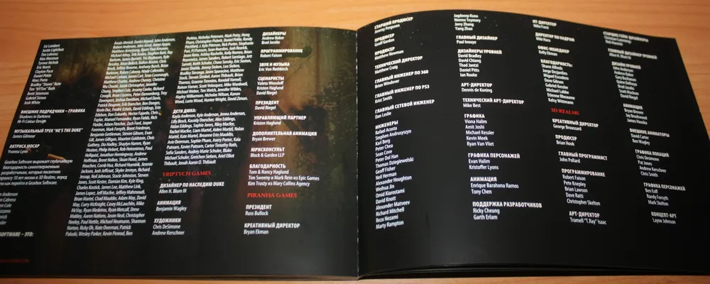 А имен в титрах на удивление немного - всего восемь страниц. Отчасти, именно поэтому Дюка пришлось ждать так долго: до Gearbox над игрой трудились совсем небольшие команды разработчиков. Но всё же, собрать воедино все имена за пятнадцать лет разработки - колоссальный труд. Надеюсь, у разработчиков припасен сюрприз для тех, кто будет смотреть финальные титры игры до конца.