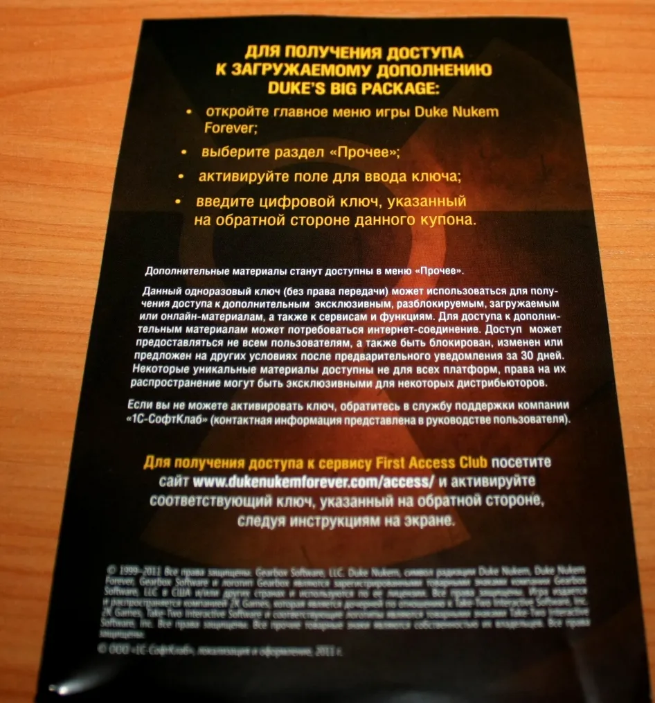 Листовка интересна тем, что ключ для DLC не напрямую активируется в стиме, а вводится внутри игры. К тому же, судя по тексту, DLC не активировать без доступа в First Access Club, ключ к которому указан на листовке отдельно. Интересно, что мешало сделать привычную активацию через Steam, учитывая что на консолях никаких заморочек с этим нет? Впрочем, это уже брюзжание. Ключ спокойно активируется через сам стим и прописывается как обычно длс, ничего особенного не требует, инструкция обманывает.