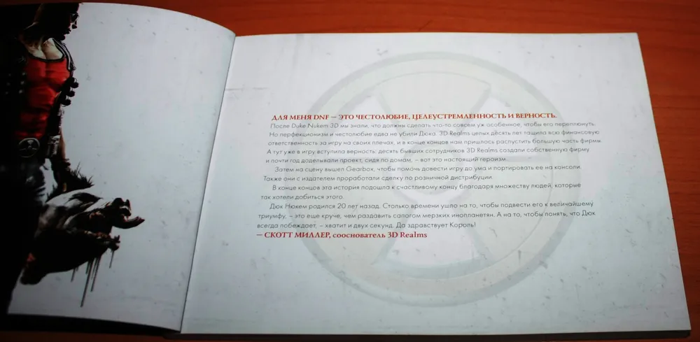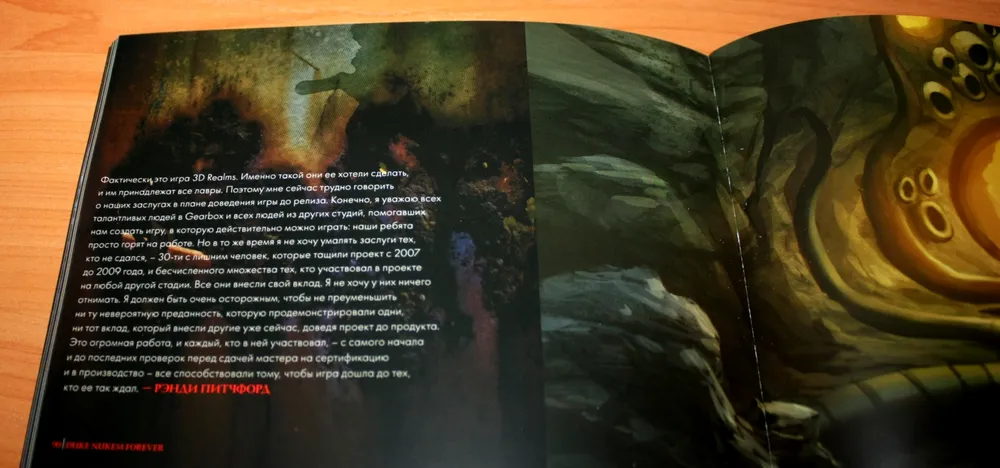 Но всё же, это не летопись разработки, и не рассказ о том, каким мог бы быть Дюк. Артбук рассказывает о том, как была создана конкретно эта версия игры, достигшая-таки прилавков. С одной стороны, оно и правильно — зачем лишний раз читать о том, что безвозвратно ушло. Но с другой стороны, только этот артбук мог рассказать всю историю целиком. Хотя кто знает, может быть разработчики подготовят и полноценный документальный фильм для настоящих фанатов?..