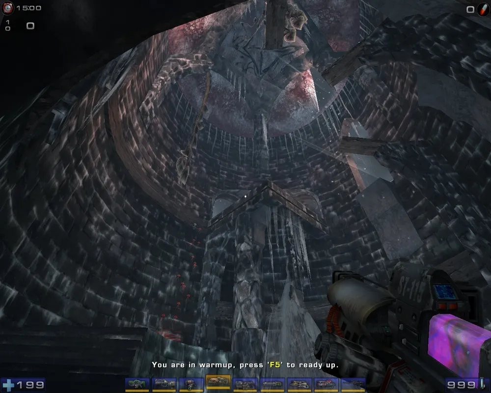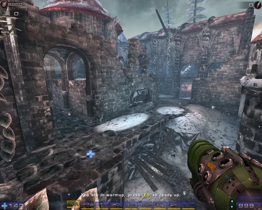 Задуманный геймплей: развитая до определенной степени вертикальная ось. Плейер старты возле оружия. Все оружие. Армор: 100, 50.