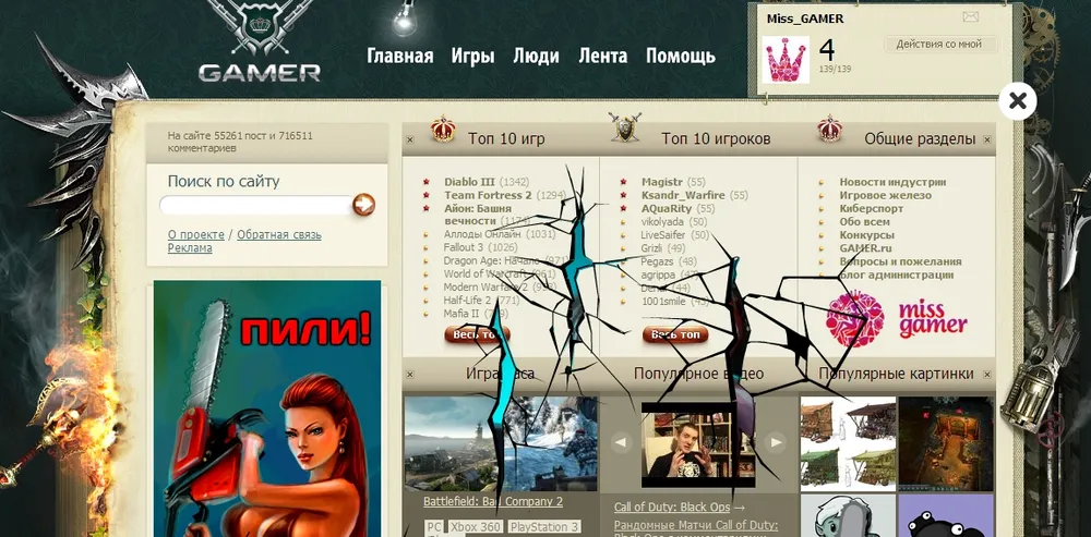 Так же раскрылась и страшная тайна с Пилой, на главной странице Gamer.ru, которая позволяет так красиво разрушать наш любимый сайт и приводить мысли в порядок.