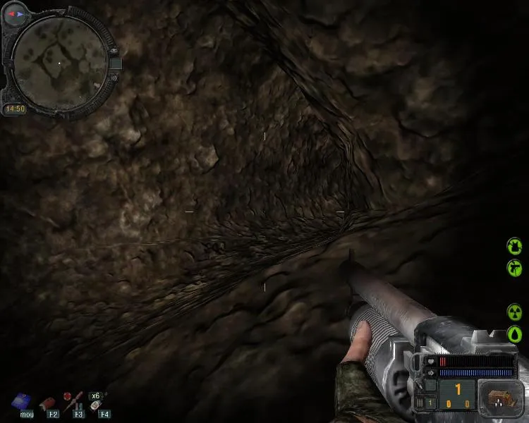 К общей атмосфере прибавился раскатистый сердитый рык где-то за углом. Атмосфера смахивает на кино-ужастик Спуск. Кстати, советую посмотреть. Оказалось, норы населяют мутировавшие хомо-сапиенсы в противогазах, перемещающиеся на четвереньках, как обезьяны, и кидающиеся на всё, что движется. Не помню, как они называются. Аборигены не только грозно рычали, но и больно кусались. Короче, выбравшись из берлоги и пристрелив последнее на сегодня пугало в «наморднике», я обнаружил за пазухой всего один патрон от дробовика, поэтому пришлось заменить верную помпу на не менее верную «Гадюку-5», с которой в обнимку я и продефилировал до базы.