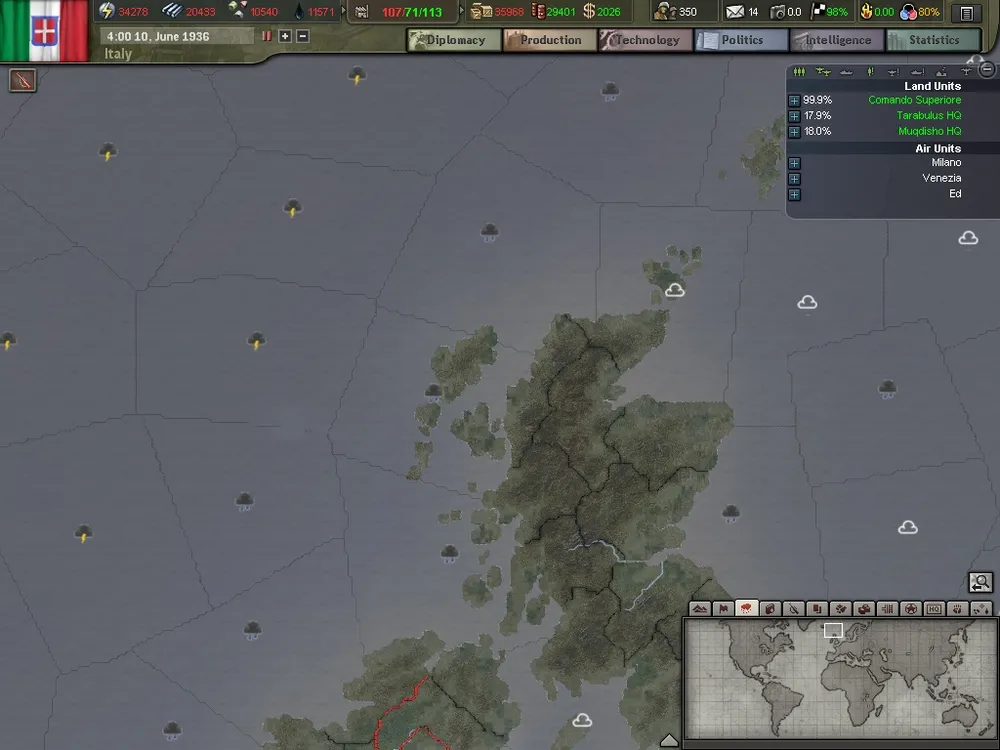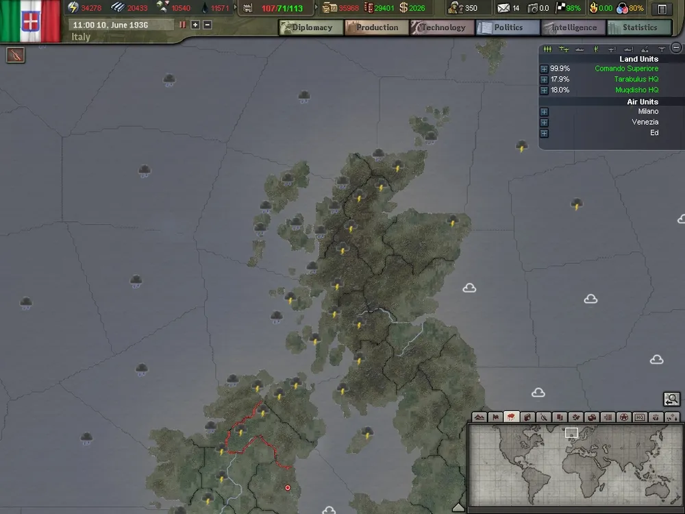 В игре вы сможете наблюдать за движением атмосферных фронтов и учитывать предполагаемую погоду при планировании боевых операций. Думаете, не напасть ли Германии на Францию? А когда лучше это сделать? В Германии сейчас идет дождь, но, судя по погодной карте, с запада идет хорошая погода, так что скоро погода будет благоприятна для нападения.