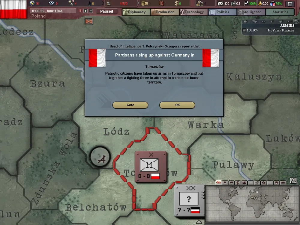 Так чем именно занимается правительство в изгнании? Поддерживает местные силы сопротивления, усиливая эффективность партизанской войны. При этом партизаны имеют технический уровень, средний между 0 и техническим уровнем страны-оккупанта (поскольку большая часть вооружения партизан будет "завоевана" у их "завоевателей"). Партизаны, конечно, поднимают восстание с точки зрения игры, так что в основном их контролирует ИИ, пытаясь создать неразбериху во вражеском лагере. Впрочем, у правительства в изгнании будет полный контроль над этими юнитами - таким образом, правительству будет чем заняться.