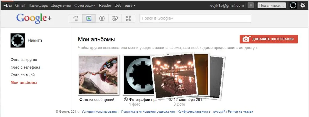 Фотоальбомы, тоже доставляют, наверное потому что идет тесная интеграция с сервисом Picasa. Можно хранить сколько угодно фотографий в очень больших разрешениях. Нажав на "фото из кругов" сервис покажет нам, как это ни странно, фото из альбомов других людей в ваших кругах.