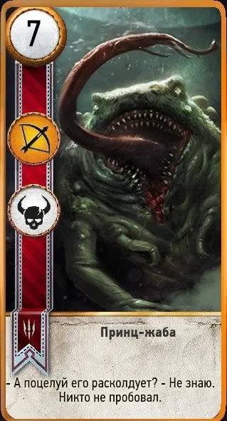 Ну и куда же мы без игровых боссов? "Принц-жаба" станет отличным дополнением колоды "Чудовищ", т.к. стрелки есть в достаточном количестве у любой фракции (карта прямо как новый Фольтест, только не лидер). Особенно грустно будет "Нильфгаарду" (прощайте, лучники, "бьющие только по коленям") и "Скоя'таэлям" (при удачном применении вместе с "Мглой" есть все шансы просто похоронить целый ряд).