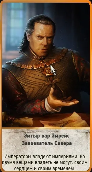 Внимание! Особенности русской локализации могут заставить вас подумать, что умение данного лидера - рай для ваших медиков, но это не так. На самом деле правильный перевод особенности этого Эмгыра выглядит так: "Умения, воскрешающие отряд, восстанавливают случайно выбранный отряд. Карта действует на обоих игроков." Вместо двойного воскрешения мы просто теряем контроль над тем, кого медики могут воскрешать. Разумеется, на героических медиков это не работает, да и вы можете так составить колоду, чтобы не стыдно было воскрешать любой отряд, если все они сильные.