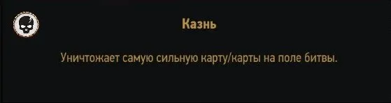 Второй совет: не пренебрегайте погодными картами. Даже если лидером соперника окажется "Король Бран", какую-то часть силы вы всё-таки уберёте, а это уже немало, да и развод погодой на карты никто не отменял. Карты "Казнь" и "Виллентретенмерт" в колоде (и, разумеется "Принц-Жаба" или "Ширру", если вы играете за "Скоя'таэлей" или "Чудовищ") также всецело приветствуются, если вы умеете их использовать в нужный момент.