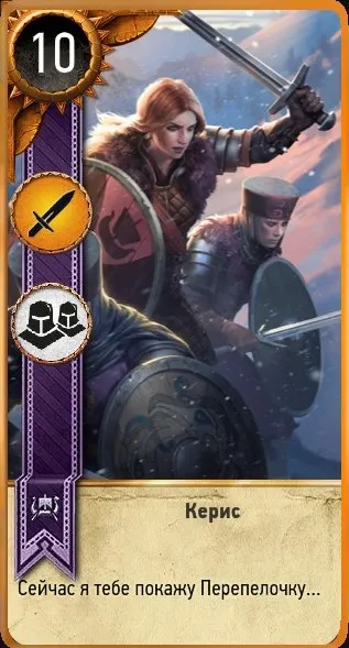 Про необходимость во всех героях я уже написала, но всё ж таки не могу не упомянуть мгновенную и очень мощную комбинацию. "Керис" - ещё одна must-have колоды. Если у вас в колоде присутствуют все три "Воительницы клана Друммонд" и вы ранее не выкладывали их на стол, то наша Перепёлочка, сама по себе силой 10, приведёт с собой подруг, и всё это общей силой в 46! Одна за всех, и все за одну!