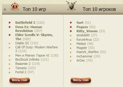 Таким образом на главной странице и на вершине рейтинга всегда будут находиться люди, чья активность и полезность не вызывает никаких сомнений, а не призраки прошлых лет. То же и с играми: в топе - те проекты, которые действительно интересны сообществу и активно обсуждаются.