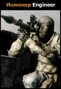 Универсальный класс по работе с техникой, будь то ее починка или уничтожение. Идеально подходит для игроков, предпочитающих вести боевые действия в технике. Укомплектованный пистолет-пулеметом или штурмовой винтовкой, имеющий глушитель, позволяет убить значительно кол-во противников. Так же за спиной всегда имеется многоцелевой противотанковый комплекс, с активно-реактивными гранатами позволяющий наносить значительный ущерб бронетехники, укрытиям пехоты, а так же стационарных огневых точек, таких как: TOW, KORD, KORN, x312. При использовании с трассирующими дротиками (газовый пистолет TRCR-4 – прим. автора) позволяет вести огонь, выстреливая реактивные снаряды из-за укрытия и не подвергая себя жизни.