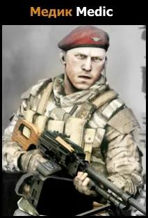 Вооружен пулеметом, который способен создавать обширный подавляющий огонь, что становиться главным козырем при обороне важных стратегических точек и срыва атак противника. Так же имеет в наличии аптечку, которая делает медика очень полезным союзником для своей команды и порой не преодолимым препятствием для врагов. Так же имеется переносной дефибриллятор, позволяющий реанимировать павших солдат, что делает медика очень важным классом в командной игре. Оживить павшего товарища можно в течение 15 секунд, после чего павший боец немедленно вернется в строй. Класс медика является осадным, бег и одновременная стрельба из пулемета приведет только к гибели самого медика. На поле боя должен передвигаться, следуя за штурмовиком и инженером, что бы в случае убийства первых была возможность воскресить союзника. В защите находясь за укрытием и в зоне действия аптечки, становится, практически не уязвим.