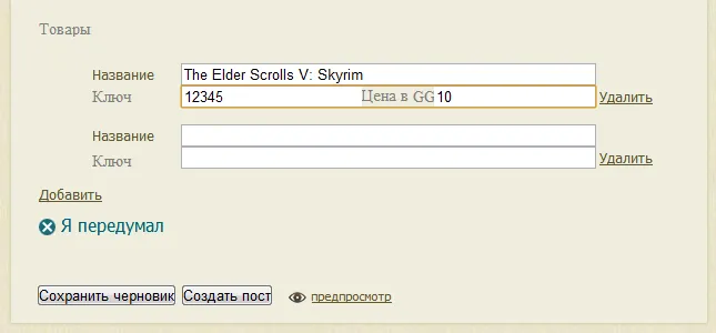 1) Публикация объявления в данный раздел будет стоить минимум 1GG и в зависимости от количества товаров повышаться. Более трех товаров - 2GG, более шести - 4GG, более девяти - 6GG и так далее. После оплаты (на основе покупки GG), покупатель автоматически будет получать в лс ключ. А для этого автор заранее загружает все ключи в пост (на основе лотереи).