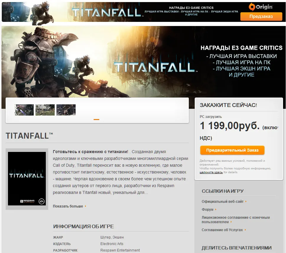 В Origin вышел официальный предварительный заказ предстоящего хита игры Titanfall. Цифровая версия игры для ПК в России стоит 1 199 рублей, по мне же это кажется немного дороговато для игры, про которую практически ничего неизвестно (в принципе) и она не является таким хитом, как серия игры Battlefield, но что же, что и имеем то имеем. Возможно, еще цена и изменится ближе к релизу но только на повышение. Поживем - увидим!