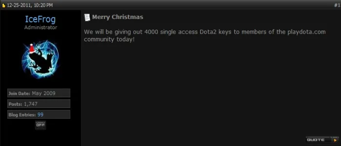 15. 26 декабря IceFrog устроил праздничную раздачу четырёх тысяч ключей пользователям Playdota.com Dota 2 в честь Рождества.