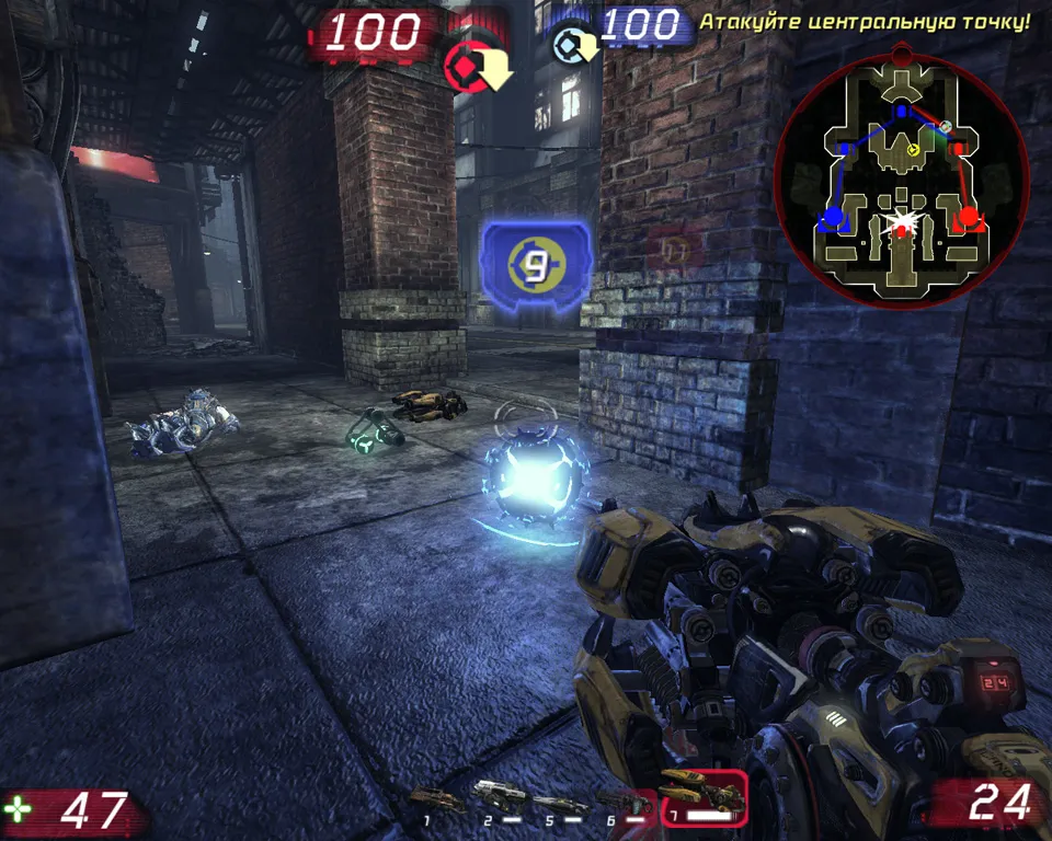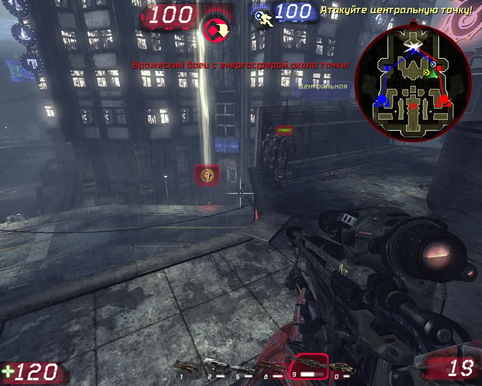Однако перед окошком, оглянувшись по сторонам, вы увидите бронежилет и ампулы здоровья. Они поднимут вашу живучесть на семьдесят единиц, и даже точный выстрел станет вам не страшен. Это очень хорошо, поскольку, во-первых, точные выстрелы — большая редкость, а значит, вы можете уцелеть и после второго выстрела, а во-вторых, путь от окна до точки недолог и занимает в среднем восемь секунд, так что вполне возможно уже после первого выстрела донести энергосферу, а после — пусть хоть на части рвут.
