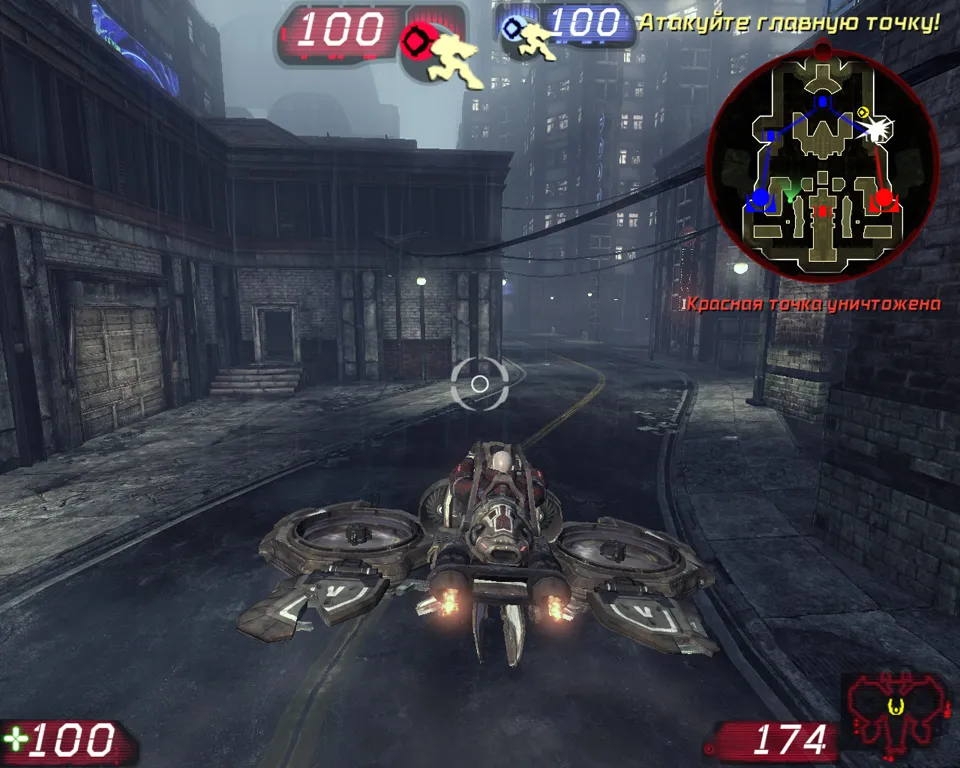 Подворотня. Прямо напротив главной точки, под серо-коричневым светящимся табло, есть проход. Если двигаться по нему, мы попадем либо к центральной точке (что очень удобно, ведь это заход во фланг, в обход основной массы бойцов), либо к противоположной. По дороге мы можем встретить ампулы здоровья и реактивные ботинки.