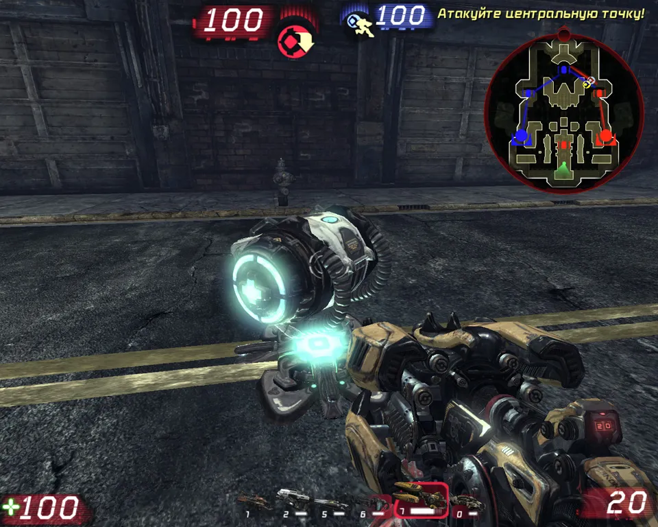 Его немного — всего три пушки ждут нас. Это, конечно же, линк — без него в режиме «Война» никуда. Ракетница — очень важное оружие, поскольку техники на карте действительно много и бороться с ней придется и ракетами в том числе. И шок, который здесь наиболее актуален, поскольку главные точки находятся в закрытых помещениях, — сфера может убить гораздо больше народу.