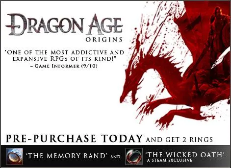 С утра сегодняшнего дня в стиме стала доступна Dragon Age. Если быть точным то предзаказ, который однако стоит соответственно - 49,99$ Комплект включает в себя два уникальных кольца. Игра станет доступна для скачивания сразу при оффициальном ее выходе.