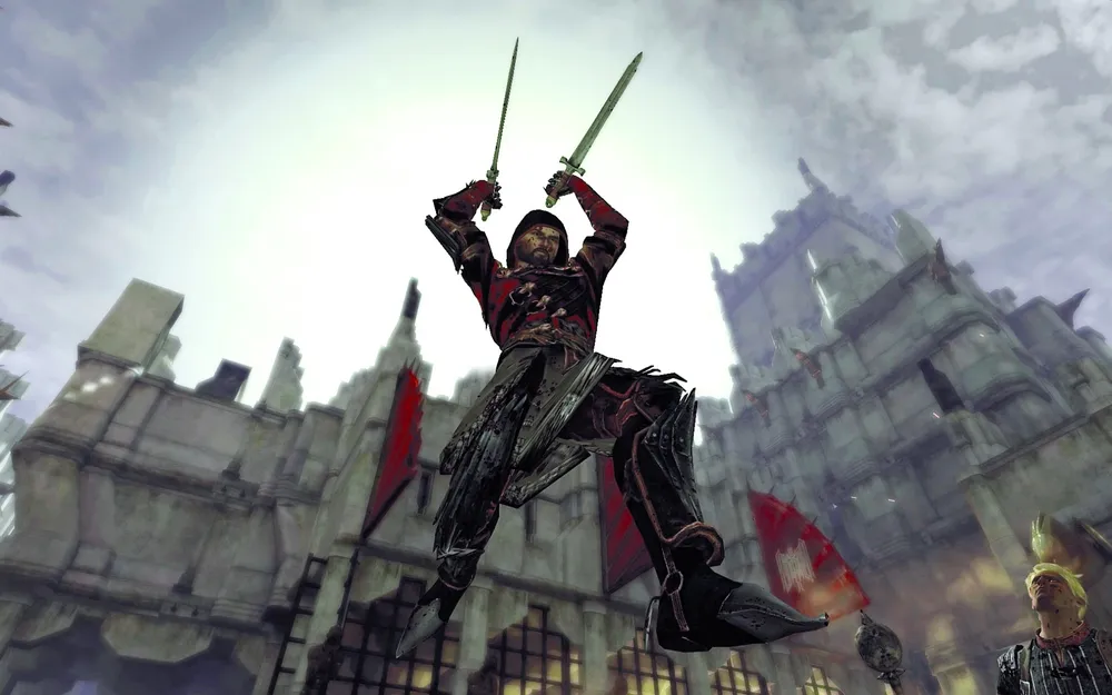 Этот скриншот, по сути, единственное, что ценно в данном ревью. Он демонстрирует нам Гаррета Хоука по классу являющегося разбойником совершающего некий замысловатый акробатический этюд.