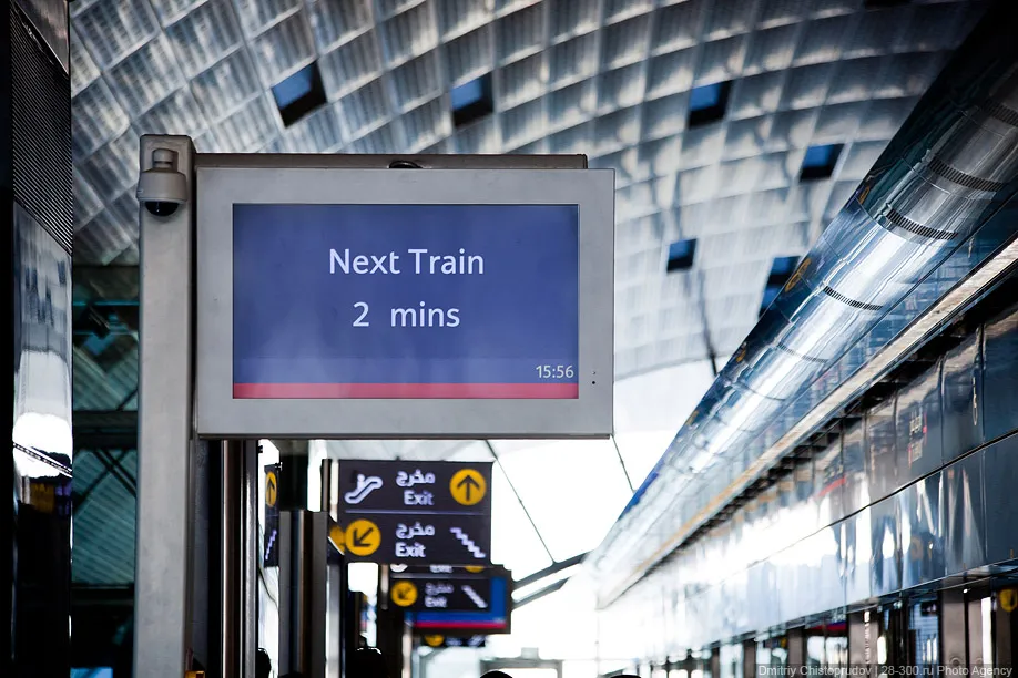 В среднем, интервал между поездами составляет 5-7 минут, что для москвича слишком долго. Успокаивает информационное табло, на котором написано, через какое время приедет поезд. Станции объявляются голосом на арабском и английском языках, а также с помощью бегущей строки светодиодного табло в вагонах поезда.