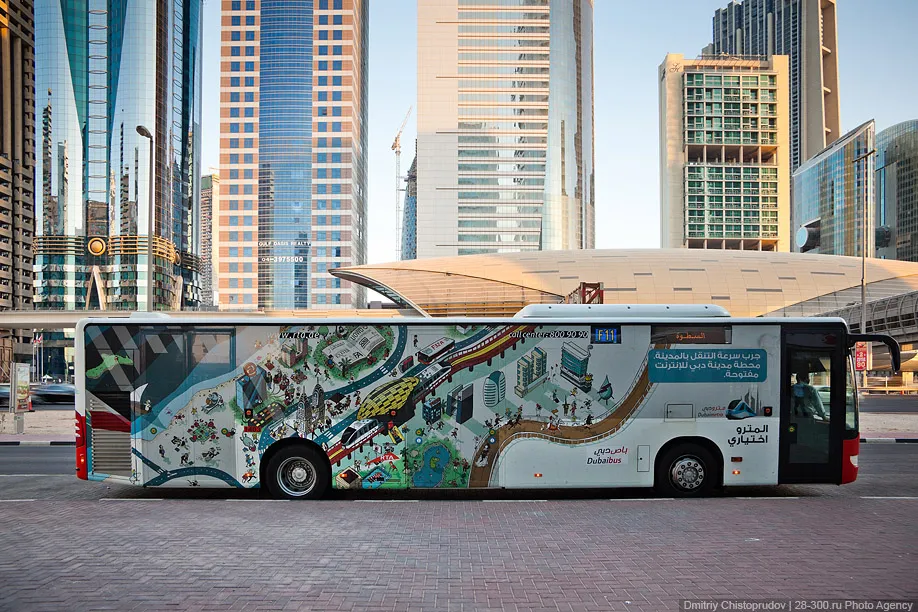 Первую линию дубайского метро обслуживают около 500 комфортабельных красиво-разрисованных автобусов. 42 новых маршрута обеспечивают транспортировку пассажиров между станциями метро и прилегающими к ним районами.
