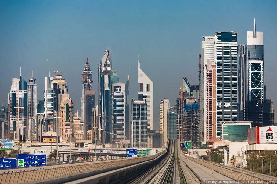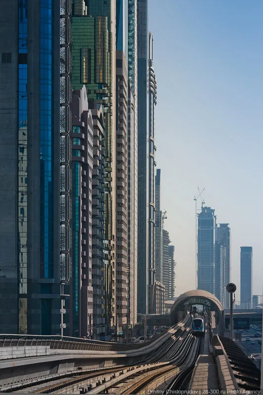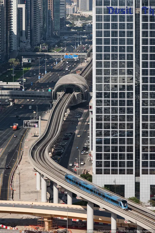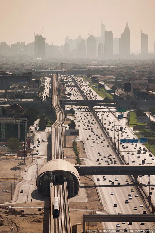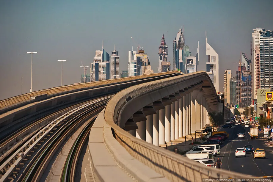 Прокатившись по «красной ветке» можно бегло посмотреть на весь Дубай. Большая часть рельс проходит по виадукам вдоль самой оживленной магистрали Эмиратов — шоссе Шейха Заеда, где выросли самые высокие небоскребы эмирата.