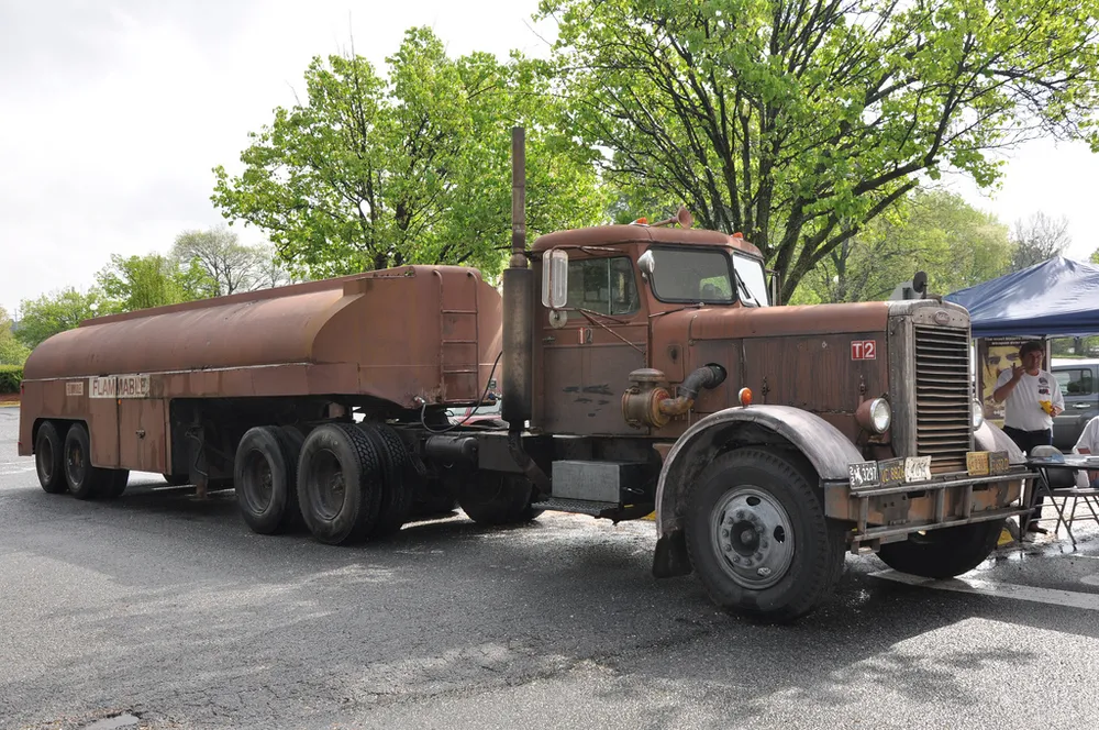 Сам образ грузовика подчёркнуто угрожающий. Полезно добавить к этому пару фактов о данной модели: можно видеть дополнительное круглое зеркало на капоте. При помощи него дальнобойщики могут следить за работой двигателя по цвету выхлопа. Большая жестяная коробка позади кабины - это ни что иное, как примитивный кондиционер. Достаточно засыпать туда лёд, и в кабину будет поступать уже охлажденный воздух. Внушительна и его цистерна - стальная пятисекционная, производства Fruehauf Trailer Corporation. Их делали еще в 1948-м, ёмкость составляет 7 000 галлонов (около 26,5 тонны).