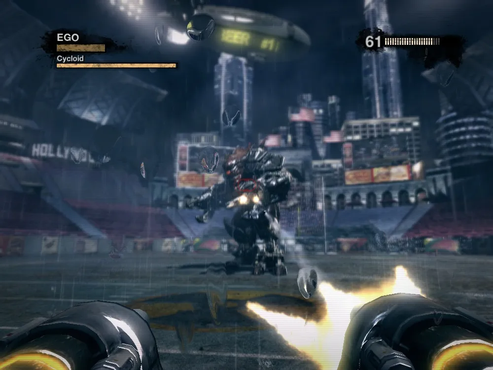 Однако врезать ими так и не удастся, ибо через пару минут нам дают Devastator и отправляют на стадион, порабощать первого босса Cycloid'а, а после забивать его глазом гол (финал DN3D).