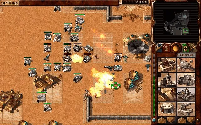 После неё разработчики продолжат осваивать жанр RTS и закрепят свой успех выпуском Command & Conquer, в котором угадывается вдохновение опытом работы над Дюной: как и в книжной вселенной Фрэнка Герберта, в мире C&C важное значение приобретает один вид ресурса - тибериум. Схема развития базы также похожа на Дюну: нужно строить электростанции, которые обеспечат работу радара и построек по созданию армии. Нужно добывать один вид ресурса специальным юнитом-добытчиком, харвестером. Это делает его очень ценным и поэтому он особенно нуждается в защите, чтобы не остаться потом без финансовой возможности нанимать новые войска. Приятным новшеством стала пресловутая "резиновая рамка", которая позволяет взять под управление большую группу подчиненных (в отличие от поочередного выкликивания юнитов в Дюне поштучно), да ещё вдобавок и контекстно-зависимый курсор позволяет запросто отдавать приказы: кликнули по месту на карте - бойцы двигаются к данной области, а кликнули по врагам - будут их атаковать. Опять же сравнение с Дюной - там нужно было выбирать команду на панели управления выбранного бойца и потом уже указывать цель. При этом существовала довольно занятная возможность отдать приказ обстреливать пустую зону... но к этому моменту я ещё вернусь попозже.