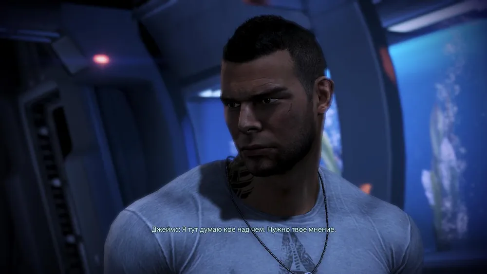 - У Джеймса мало диалогов с Шепардом, но довольно много бесед с другими персонажами, в особенности с Гаррусом.