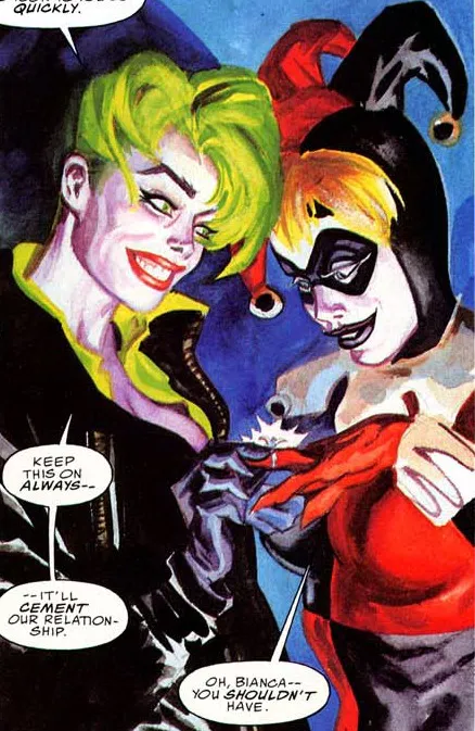 Но и это ещё не всё! Главным козырем (как бы смешно это не звучало) комикса оставался Джокер! Он (или теперь уже писать "она"? )) ) был девушкой! Главным злодеем под именем "Джокер" в комиксе выступала дочь мафиозного босса по имени Бьянка Стиплчейз.
