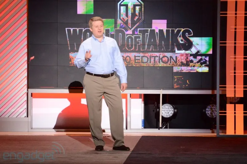 Глава Wargaming Виктор Кислый — на сцене. («Ой, и тут Уорлд оф Тенкс, — пишет в скайп коллега по подкасту Александр Башкиров. — Негры в Лос-Анджелесе на ржавых машинах будут писать про WoT! Братья Уайансы в танке с прокачанными рессорами!»)