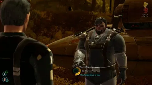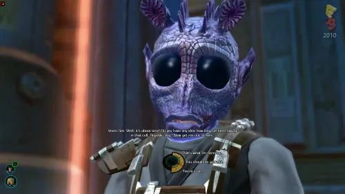 Zoidberg – Если вы играли в “Mass Effect”, то вы знаете, что делать в The Old Republic. Игровые беседы увлекли меня невероятной озвучкой еще до предложения нескольких вариантов для выбора ответа. Хоть ответ и был предельно очевидным – хороший или плохой – но конкретные формулировки могли варьироваться от кратких и до развернутых ответов. Конечно, если вы не хотите это слушать, то клавиша ”пробел” вам в помощь.