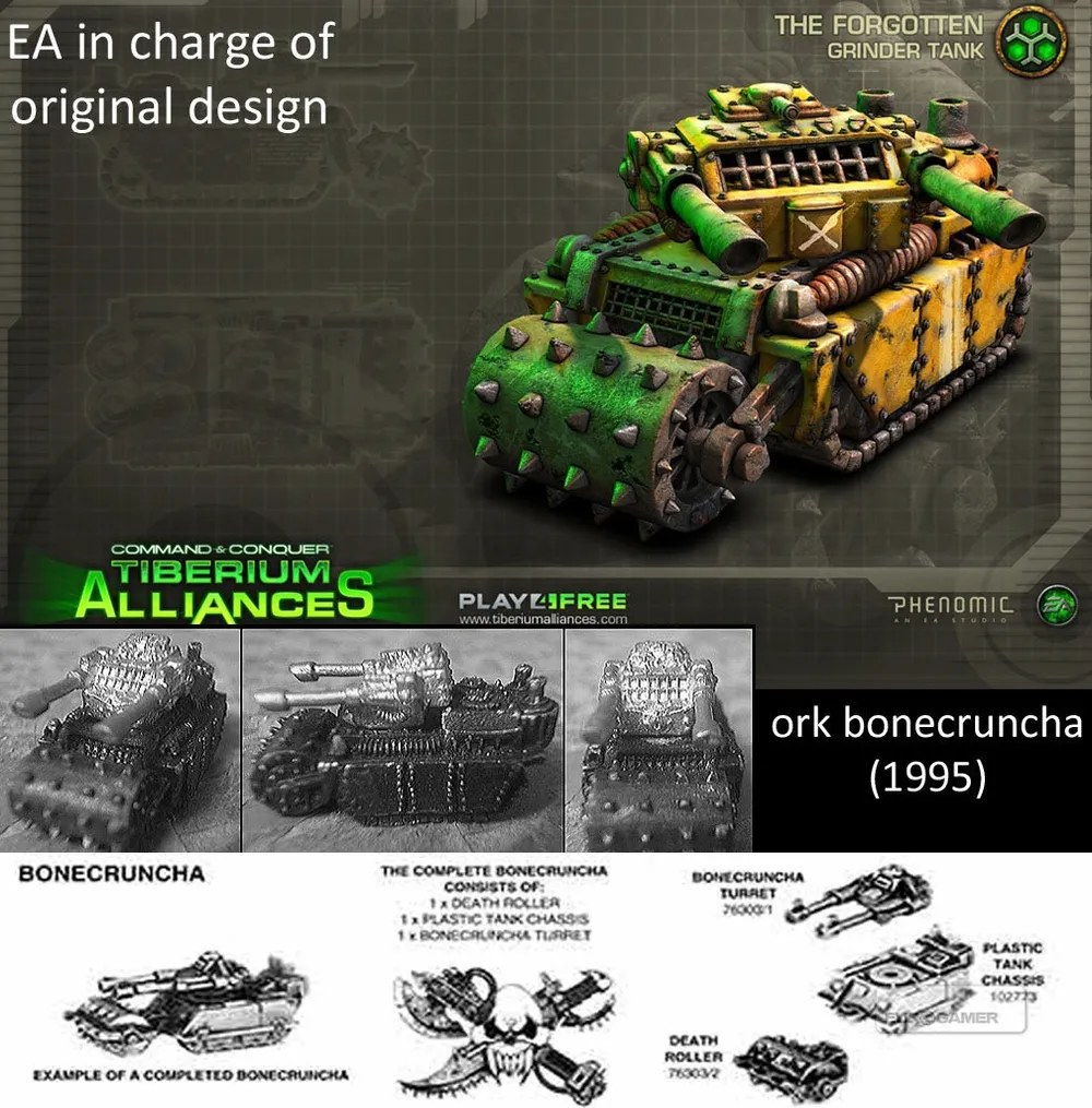 Многие недоумевают, за что Electronic Arts признали худшей американской компанией. Возможный ответ — «потому что подвернулась». Что делать, EA постоянно подворачивается кому-нибудь; на этот раз компания подвернулась бдительным пользователям Reddit, уличившим в плагиате создателей браузерной онлайн-стратегии Command & Conquer: Tiberium Alliances из принадлежащей EA германской студии Phenomic. Нет, речь не идет о том, что CCTA представляет собой Plants Vs. Zombies с танками. Дело в самих танках. Reddit-пользователи наглядно сравнили эскиз Grinder Tank Забытых (тибериумных мутантов) из CCTA и модель орочьего танчика Bonecruncha из вселенной Warhammer 40000 (даже решетка между пушками одинаковая!).