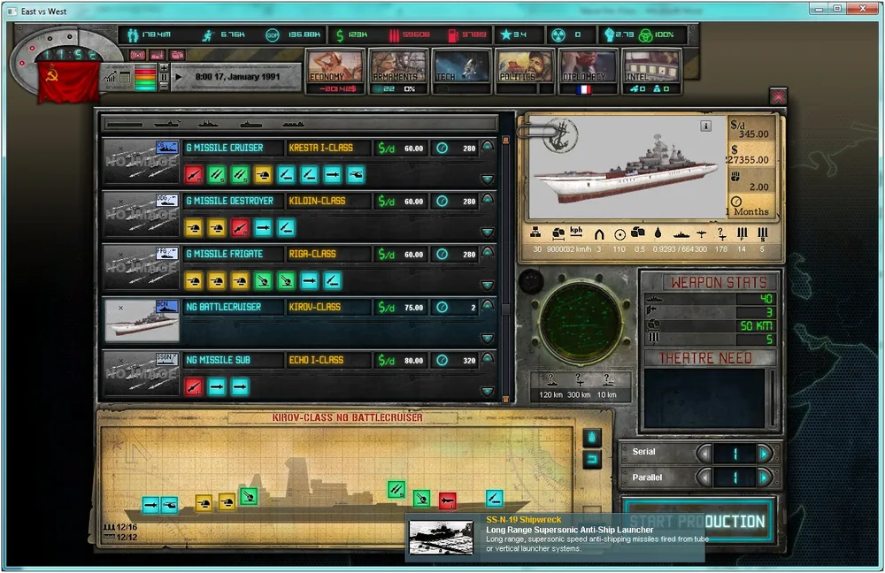 Последний в списке, но не по значению, потрясающий образец кораблестроения Холодной войны – тяжелый атомный ракетный крейсер класса «Киров». На самом деле это многоцелевой корабль, но мы предназначили его для двух ролей: уничтожение кораблей на больших расстояниях и защита флота. Этот корабль очень хорош как пример высокой защиты (высокий параметр организации) и защитной платформы с бонусами к обороне. У него также есть системы вертикального запуска и ПВО средних дистанций, что делает его отличным выбором как корабля сопровождения основных кораблей типа авианосца. Редактор показывает все иконки оружия с фотографиями и информацией, параметры вооружения и максимальное количество слотов и размера оружия. Все компоненты можно менять одним щелчком. Полученный корабль можно немедленно начать производить как массово, так и в единичном экземпляре.