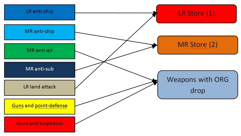 Если немного углубиться, использующие боеприпасы оружейные компоненты соединены с главными (Р на картинке) или вспомогательными (S) складами. Количество снарядов ограничено, они очень дороги и эффективны.