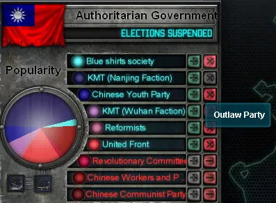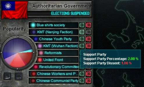 Все партии, кроме коммунистов и маоистов (две нижние красные) и фашистов с патерналистами (верхние серая и синяя) считаются демократическими или полудемократическими и не могут приостанавливать выборы. Если в вашей стране побеждает любая диктаторская партия, выборы немедленно прекращаются на неопределенный срок. Эти партии сразу же возьмут управление над всей политической жизнью в стране, чтобы навести порядок. Больше не нужно беспокоиться о политических предпочтениях своего народа!