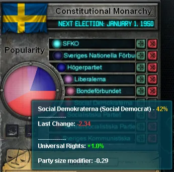 Вы можете использовать свою возможность поддержать партию (нажав на зеленый «+» рядом с названием). Однако при такой поддержке вы рискуете рассердить граждан и вызвать недовольство, но это ваш выбор. Если ничего не помогает, вы можете запретить партию и отстранить ее от участия в выборах; ожидайте также, что улицы наполнятся их разозленными сторонниками. Запрет не позволит партии получить толику власти, но может увеличить ее популярность. Возможно, вы чуточку дальновиднее? Попробуйте изменить законы и не допускать досадных хиппи до выборов таким законом, как «Махинации», который дает хороший толчок правящей партии, или почему бы вовсе не стремиться к однопартийной системе?