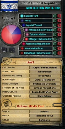 Итак, у вас есть граждане со своими желаниями и политическими предпочтениями и сформированное правительство. Это неплохой момент для введения новых законов. В «East vs West» законы не всегда легко изменить, иногда даже проблематично. Законы в игре – обширная абстракция конституции и основных направлений, которая определяет основные правила жизни государства. Законы обычно связаны с общими понятиями, например национальным единством или нейтралитетом во внешней политике, а также с такими важными вопросами, как гражданские свободы, законы о выборах и статусе организованной религии. Следовательно, изменение закона может сильно повлиять на жизнь в стране.