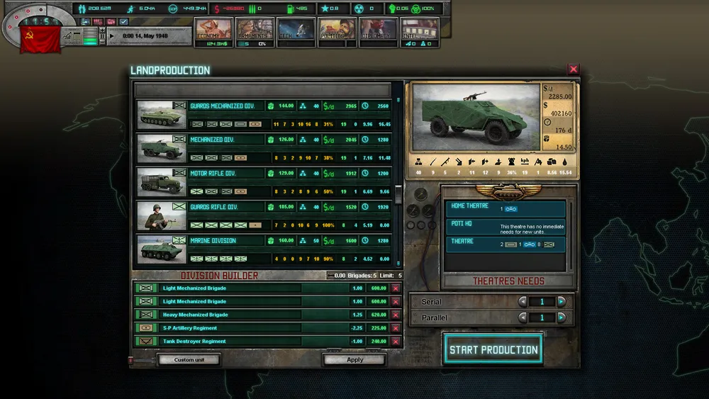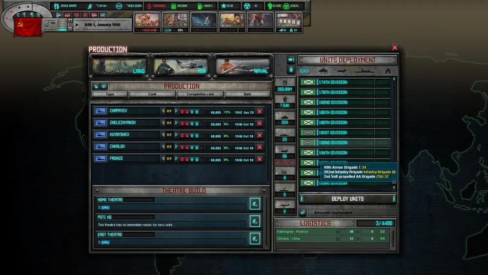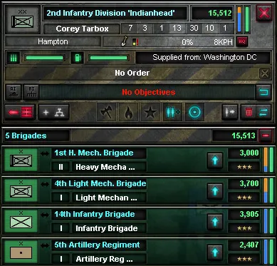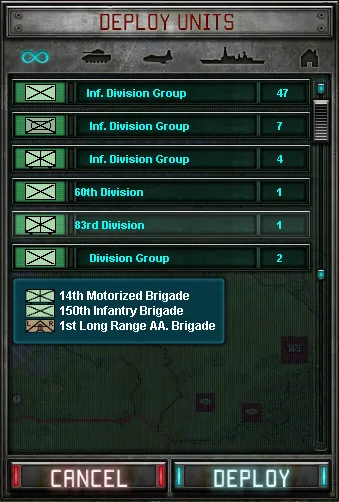 Как вы видите, мы отметили цветом все наземные войска и разделили их на основные (помечены зеленым) и вспомогательные (отмечены коричневым). Основные войска - хребет любой армии и составлены из пехотных или механизированных бригад. Они дают вам положительную ширину. Вспомогательные войска дают отрицательную ширину, и в сочетании игрок сможет строить дивизии, только если сумма всех бригад в дивизии положительная. Это, разумеется, зависит от способности каждой основной бригады защищать определенные вспомогательные. Например, ополчение практически неспособно поддерживать вспомогательные бригады, в то время как механизированная бригада очень даже способна. Это значит, что отныне дивизии, которые вы построите и дивизии, с которыми вы столкнетесь, будут беспрецедентно реалистичны и сбалансированы, и в то же время интуитивно понятны и просты в управлении.