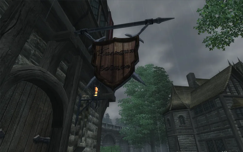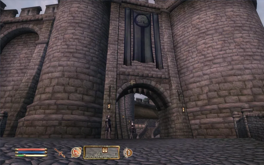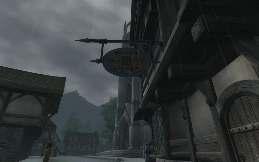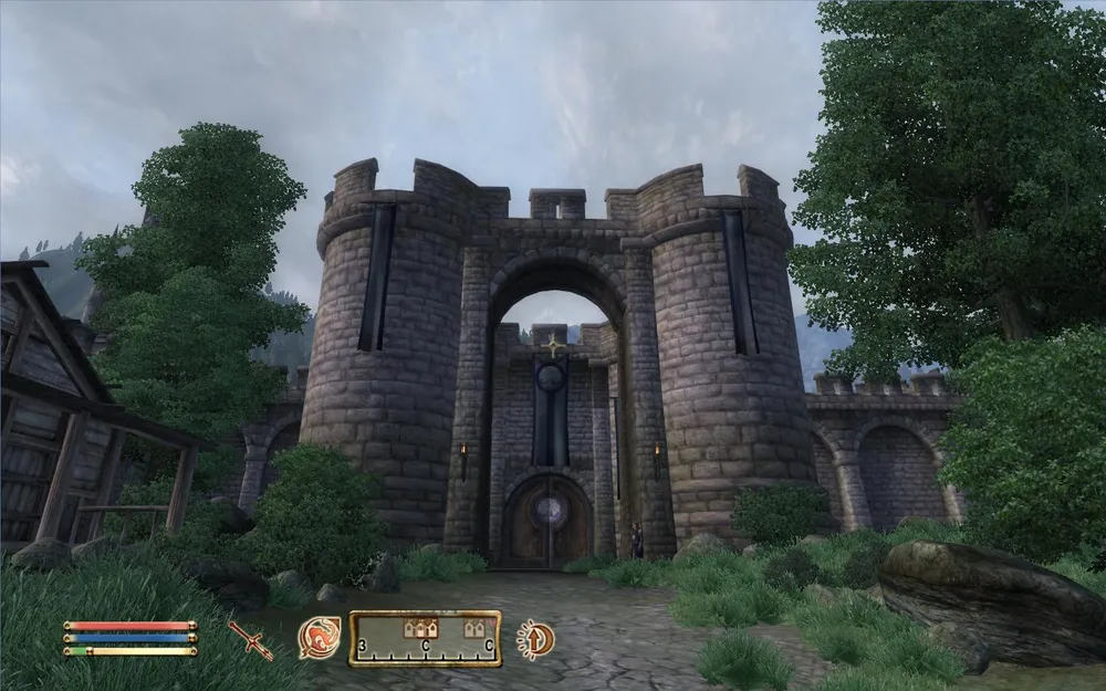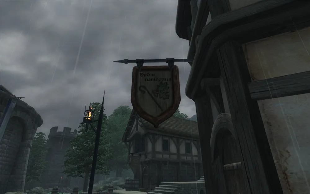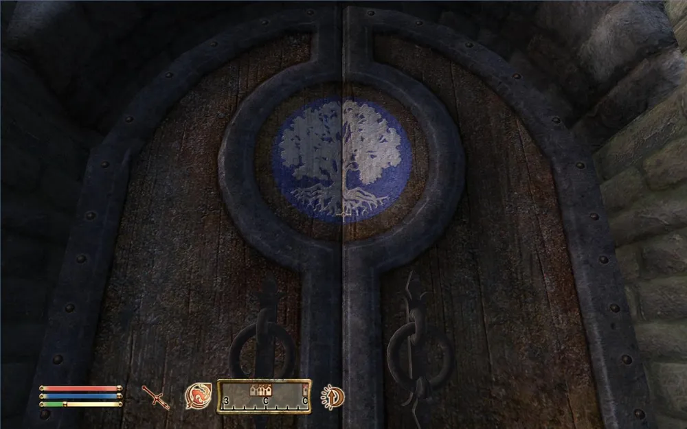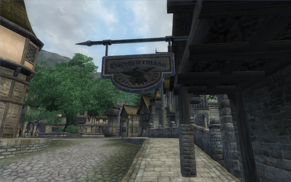 Чуть подойдя можно увидеть мощные ворота с знаком дерева на синем фоне.Авторы игры смотрели властелина колец Почему то знак выглядит смутно знакомым, но не могу вспомнить где его видел и прошу привратника открыть ворота. Через минуту криков привратник всё таки услышал меня и я смог войти в город.