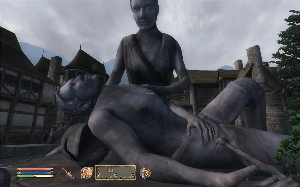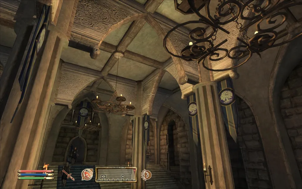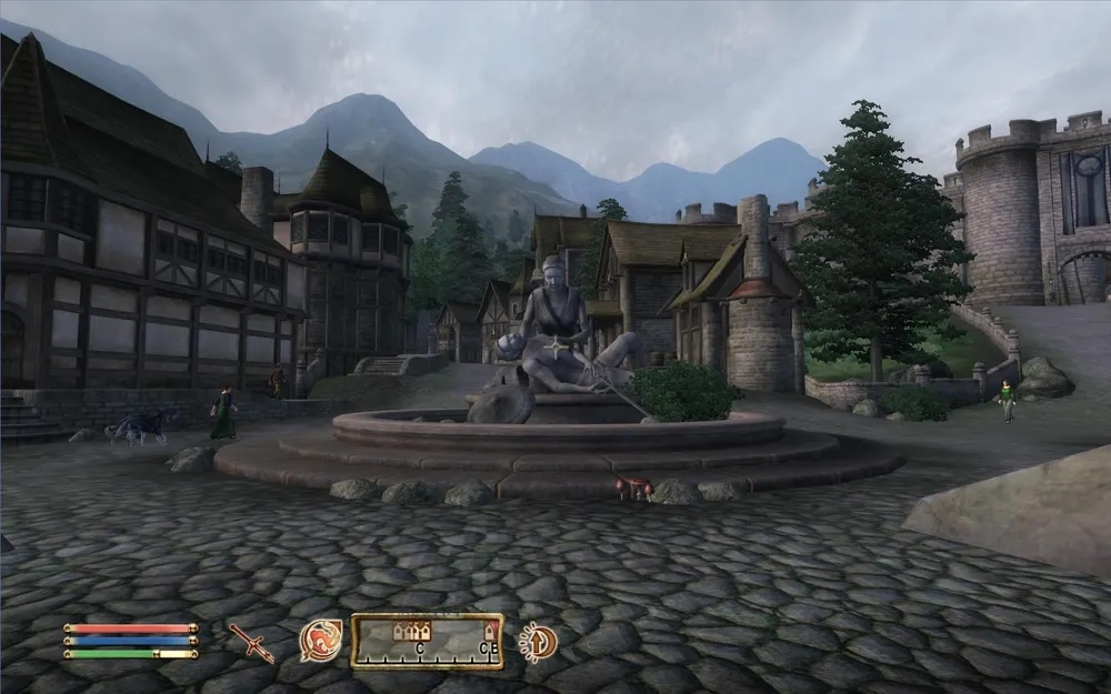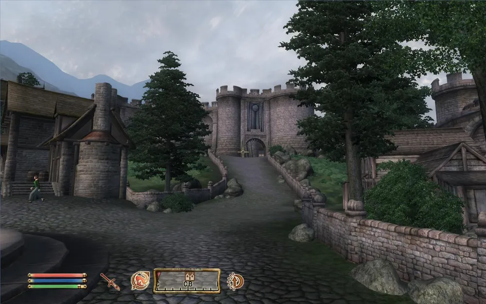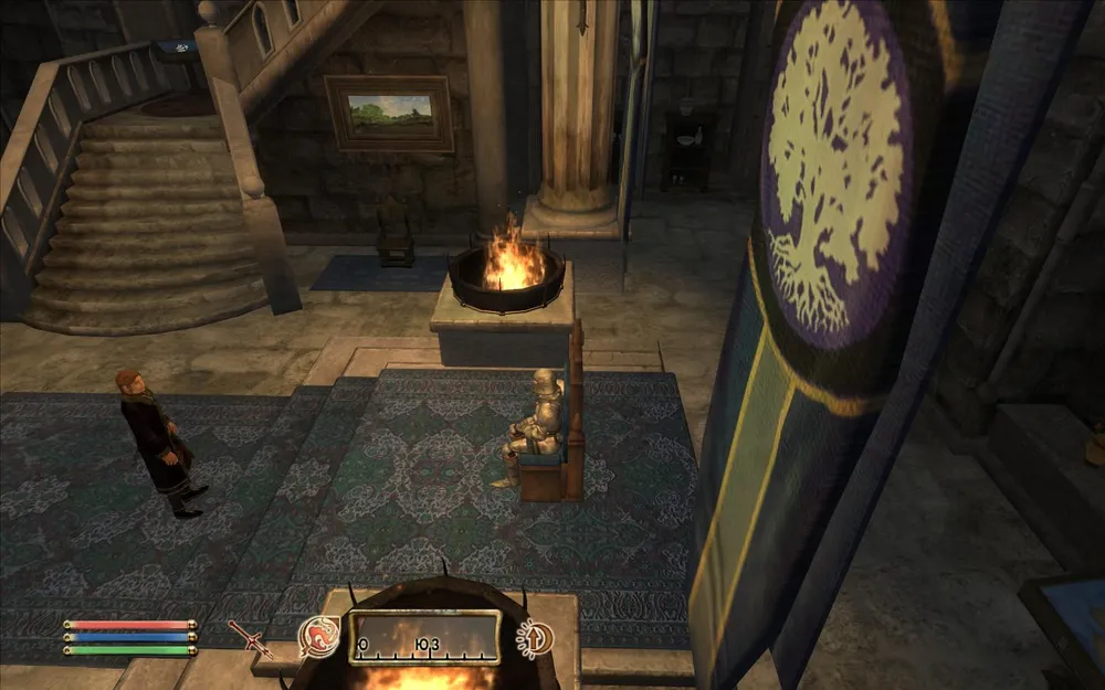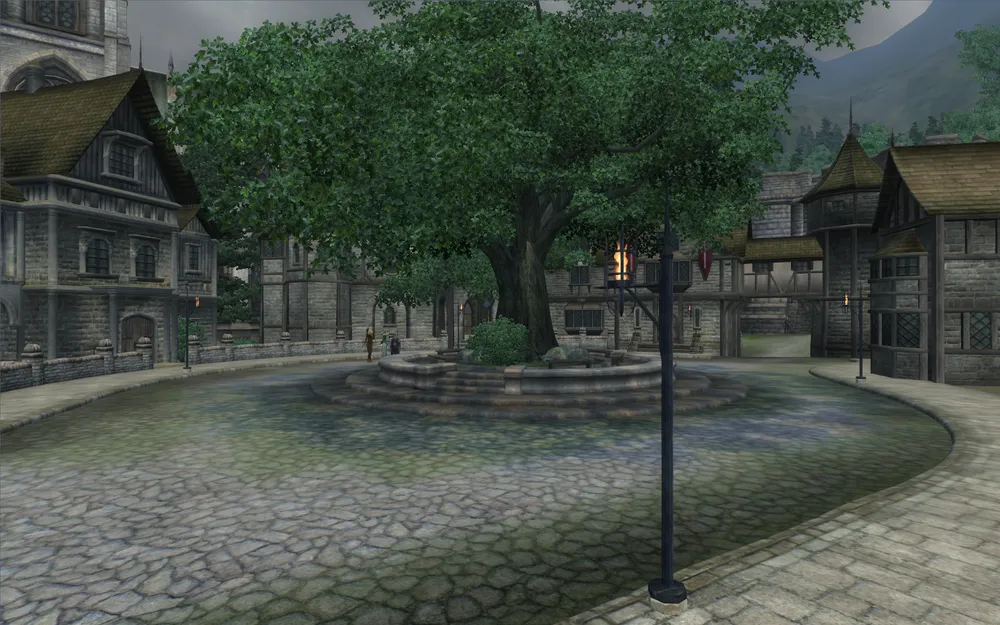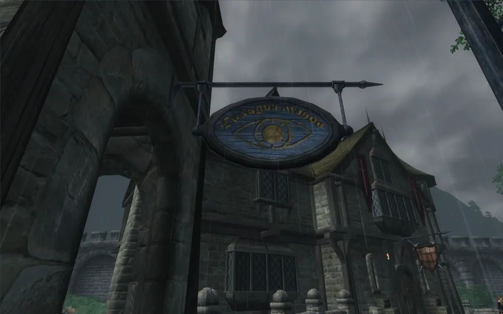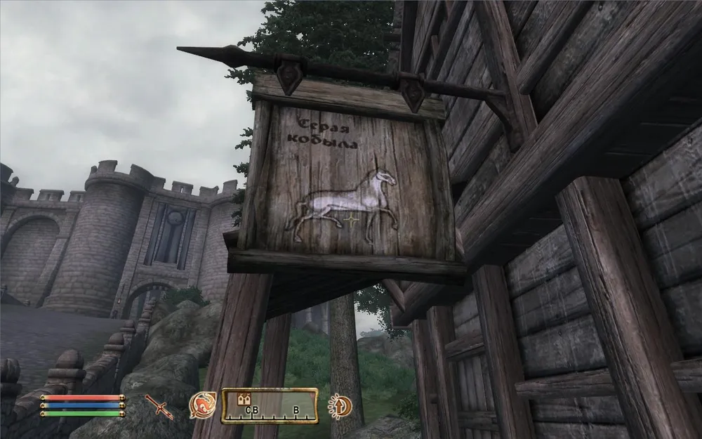Чуть подойдя можно увидеть мощные ворота с знаком дерева на синем фоне.Авторы игры смотрели властелина колец Почему то знак выглядит смутно знакомым, но не могу вспомнить где его видел и прошу привратника открыть ворота. Через минуту криков привратник всё таки услышал меня и я смог войти в город.