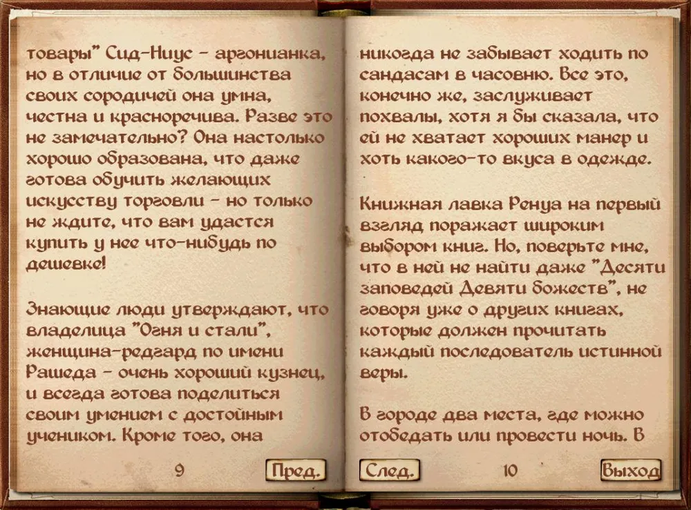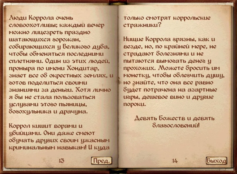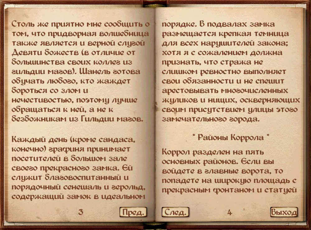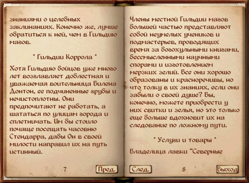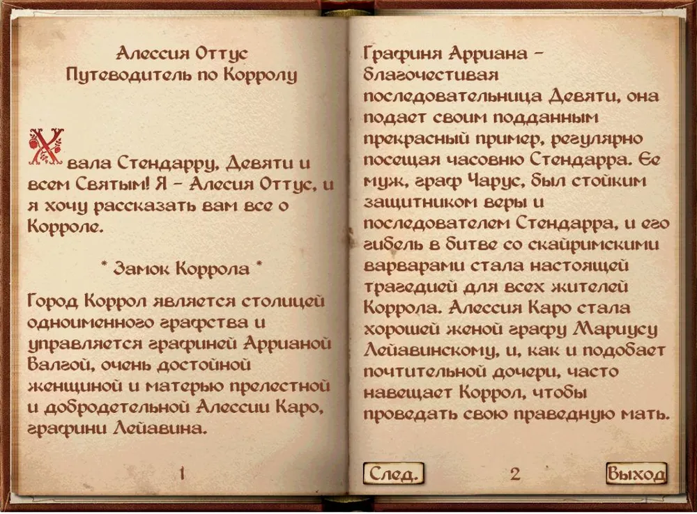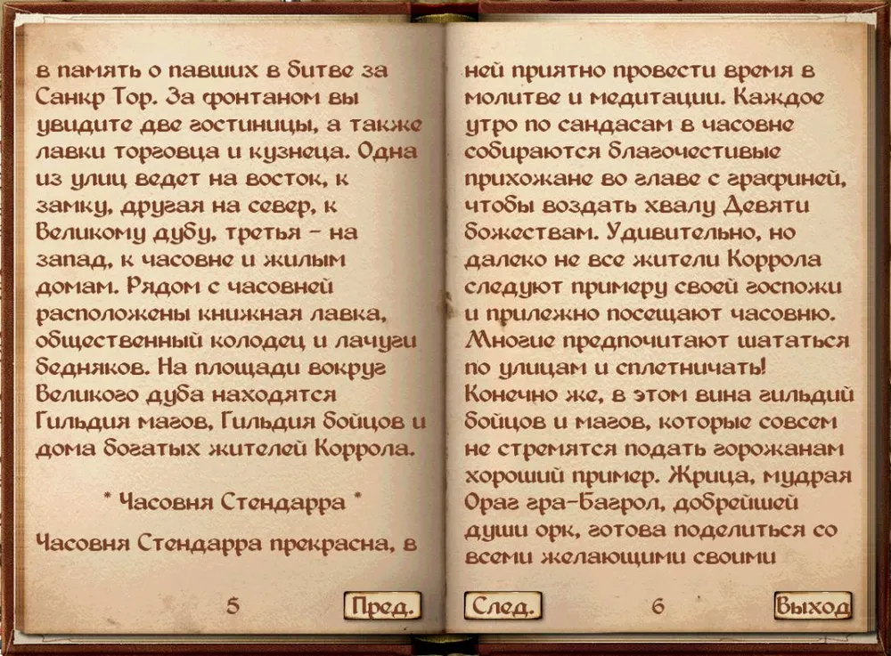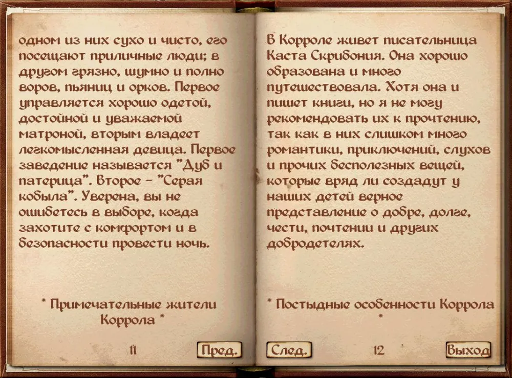 Занимательная книга, и главное после неё заснул мгновенно. Правда половина всего написанного в ней реклама чистой воды. Но это вполне нормально для путеводителей. Зато я узнал, кто правит Корролом (Правда я уже и так знал), кому поставлен памятник ну и про дуб узнал. И про отношение к гильдиям, интересно к ним так везде относятся? А то я в гильдию магов хотел вступить..