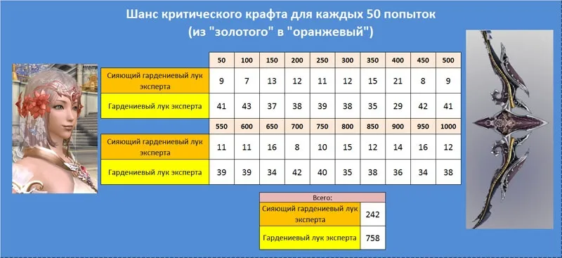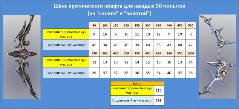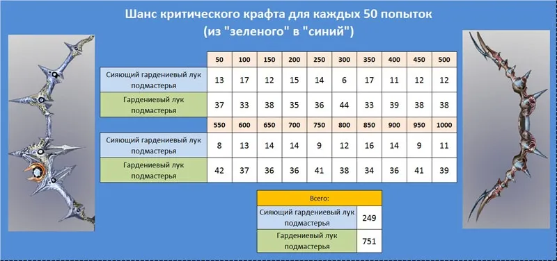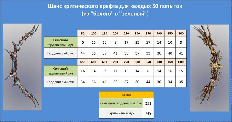 Таблица ясно показывает – миф развеян! Шанс получить редкий лук явно выше 10%, и примерно равен шансу создать Горячее сердце магии (см. Эксперимент №2)